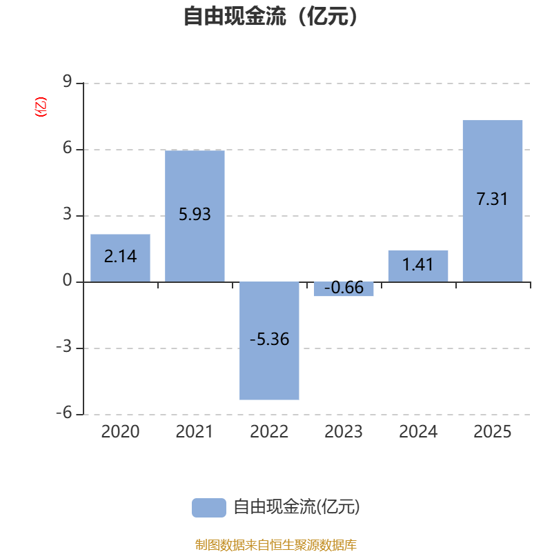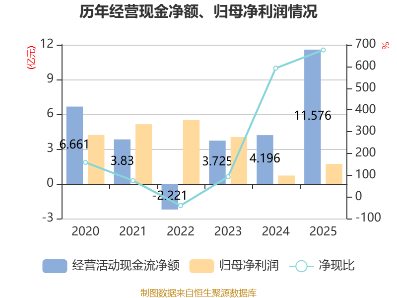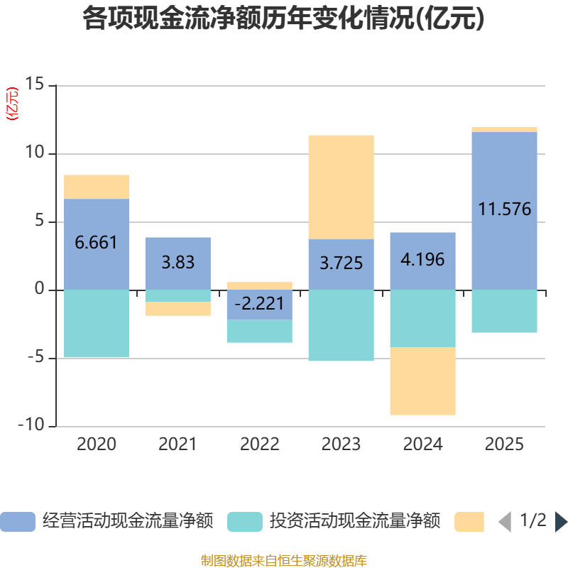 截至2025年,公司经营活动现金流净额为11.58亿元,同比增长175.89%;筹资活动现金流净额3556.04万元,同比增加5.32亿元;投资活动现金流净额-3.15亿元,上年同期为-4.24亿元。