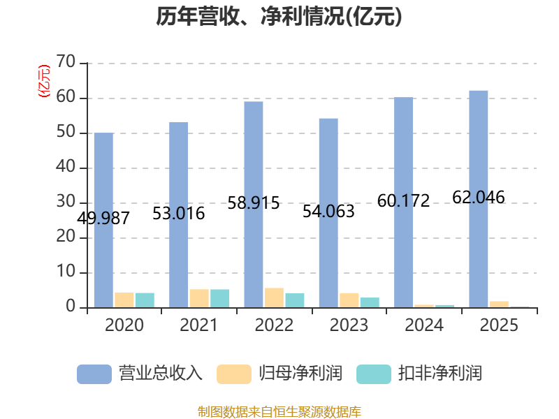 中证智能财讯中牧股份(600195)4月24日披露2025年年度报告。2025年,公司实现营业总收入62.05亿元,同比增长3.11%;归母净利润1.71亿元,同比增长141.68%;扣非净利润2024.76万元,同比下降67.42%;经营活动产生的现金流量净额为11.58亿元,同比增长175.89%;报告期内,中牧股份基本每股收益为0.1678元,加权平均净资产收益率为3.07%。公司2025年度分配预案为:拟向全体股东每10股派现0.51元(含税)。