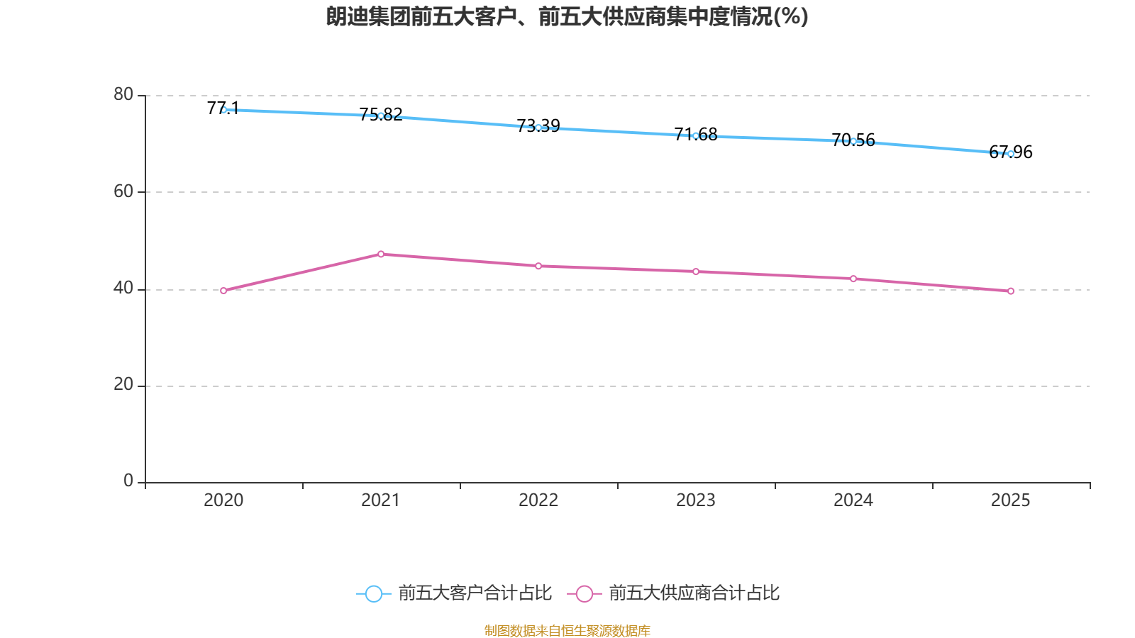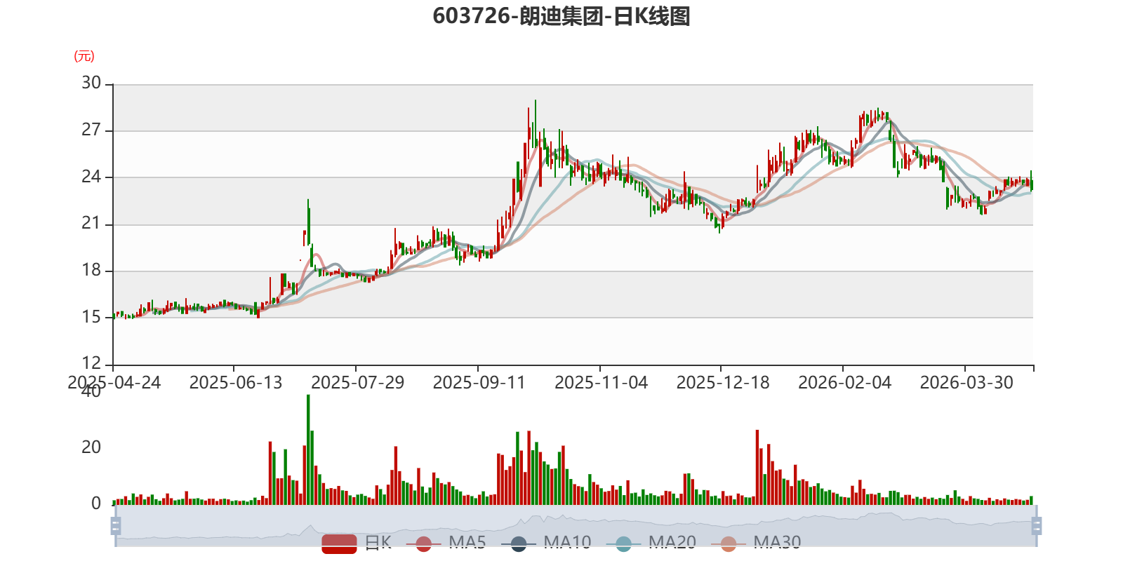 中证智能财讯朗迪集团(603726)4月24日披露2025年年度报告。2025年,公司实现营业总收入18.23亿元,同比下降3.74%;归母净利润1.77亿元,同比增长3.00%;扣非净利润1.28亿元,同比下降16.13%;经营活动产生的现金流量净额为1.8亿元,同比增长83.40%;报告期内,朗迪集团基本每股收益为0.96元,加权平均净资产收益率为13.22%。公司2025年度分配预案为:拟向全体股东每10股派现5.5元(含税)。