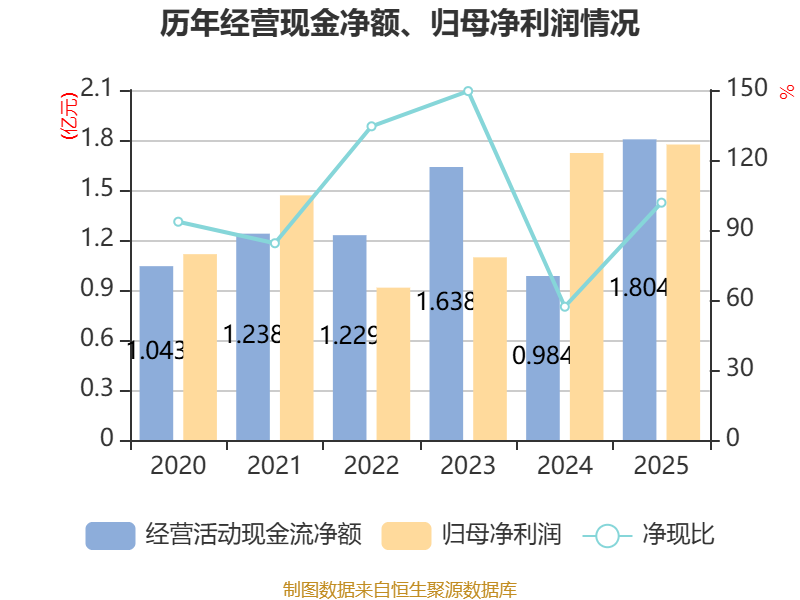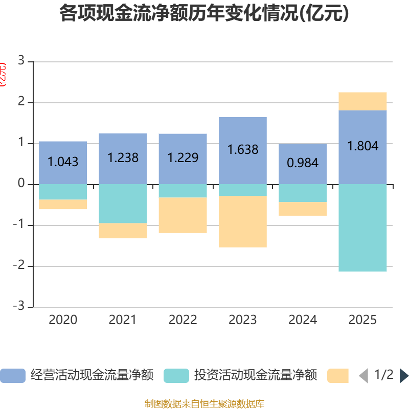 截至2025年,公司经营活动现金流净额为1.8亿元,同比增长83.4%;筹资活动现金流净额4385.54万元,同比增加7712.48万元;投资活动现金流净额-2.14亿元,上年同期为-4412.22万元。