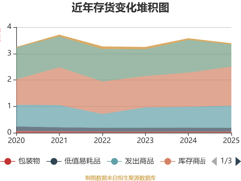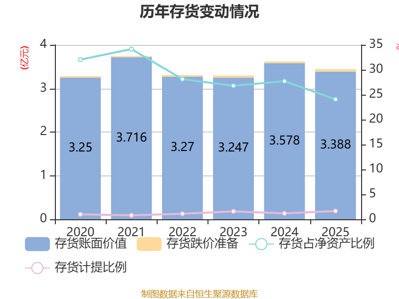 从存货变动来看,截至2025年末,公司存货账面价值为3.39亿元,占净资产的24.07%,较上年末减少1894.96万元。其中,存货跌价准备为567.85万元,计提比例为1.65%。
