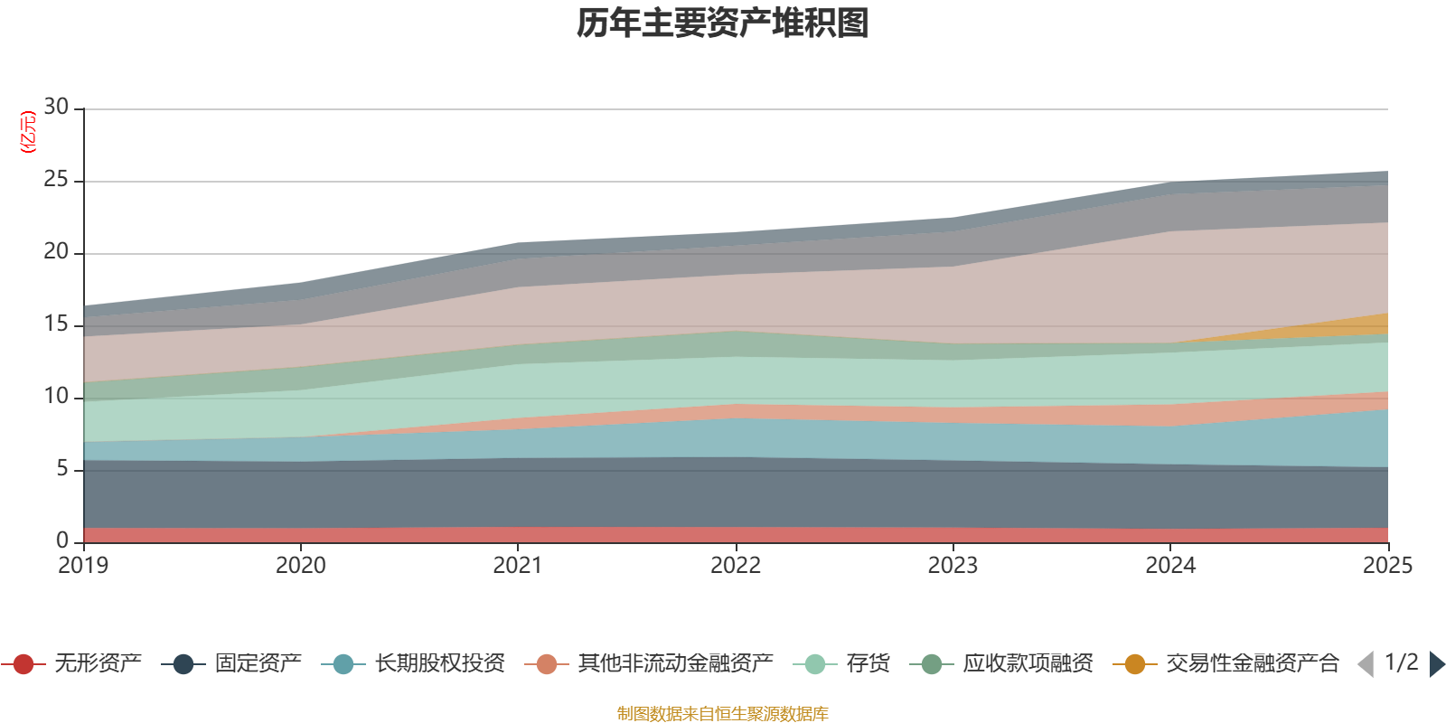 资产重大变化方面,截至2025年末,公司应收票据及应收账款较上年末减少18.95%,占公司总资产比重下降6.63个百分点;交易性金融资产合计占公司总资产的5.62%,上年末为0;长期股权投资较上年末增加52.71%,占公司总资产比重上升5.08个百分点;固定资产较上年末减少6.12%,占公司总资产比重下降1.6个百分点。