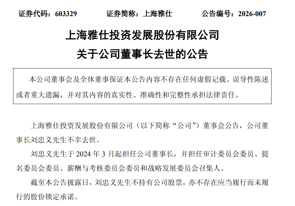 4月23日,上海雅仕投资发展股份有限公司(以下简称“上海雅仕”)发布公告称,董事长刘忠义不幸去世。
