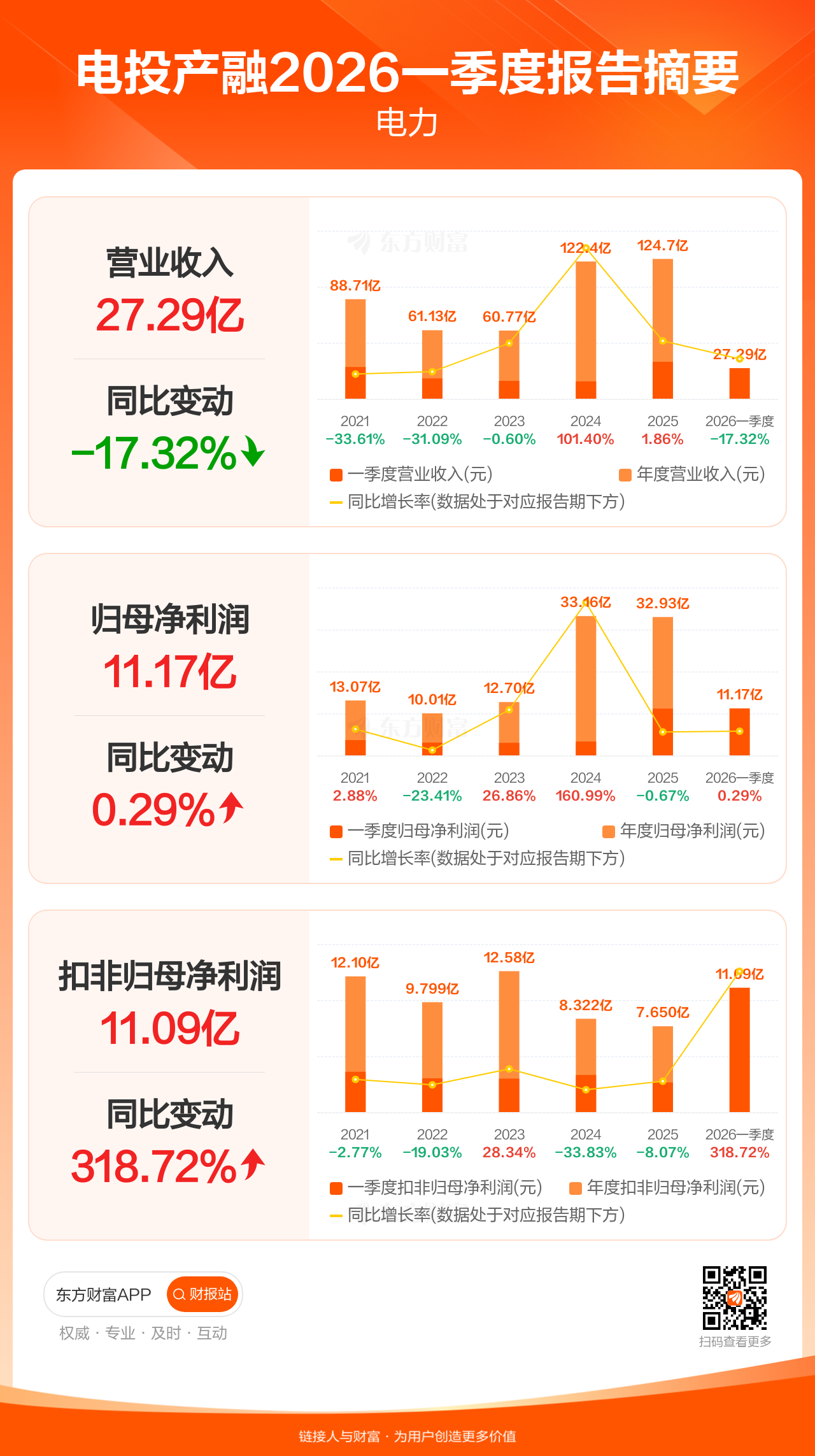 电投产融4月24日发布2026年一季报显示,公司一季度实现营业收入27.29亿元,同比下滑17.32%;归母净利润11.17亿元,同比增长0.29%;扣非归母净利润11.09亿元,同比增长318.72%。