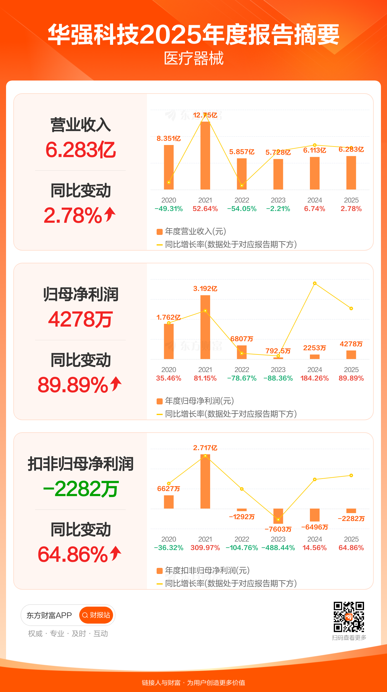 华强科技4月24日发布2025年年报显示,公司全年实现营业收入6.28亿元,同比增长2.78%;归母净利润4277.75万元,同比增长89.89%;扣非归母净利润-2282.44万元。