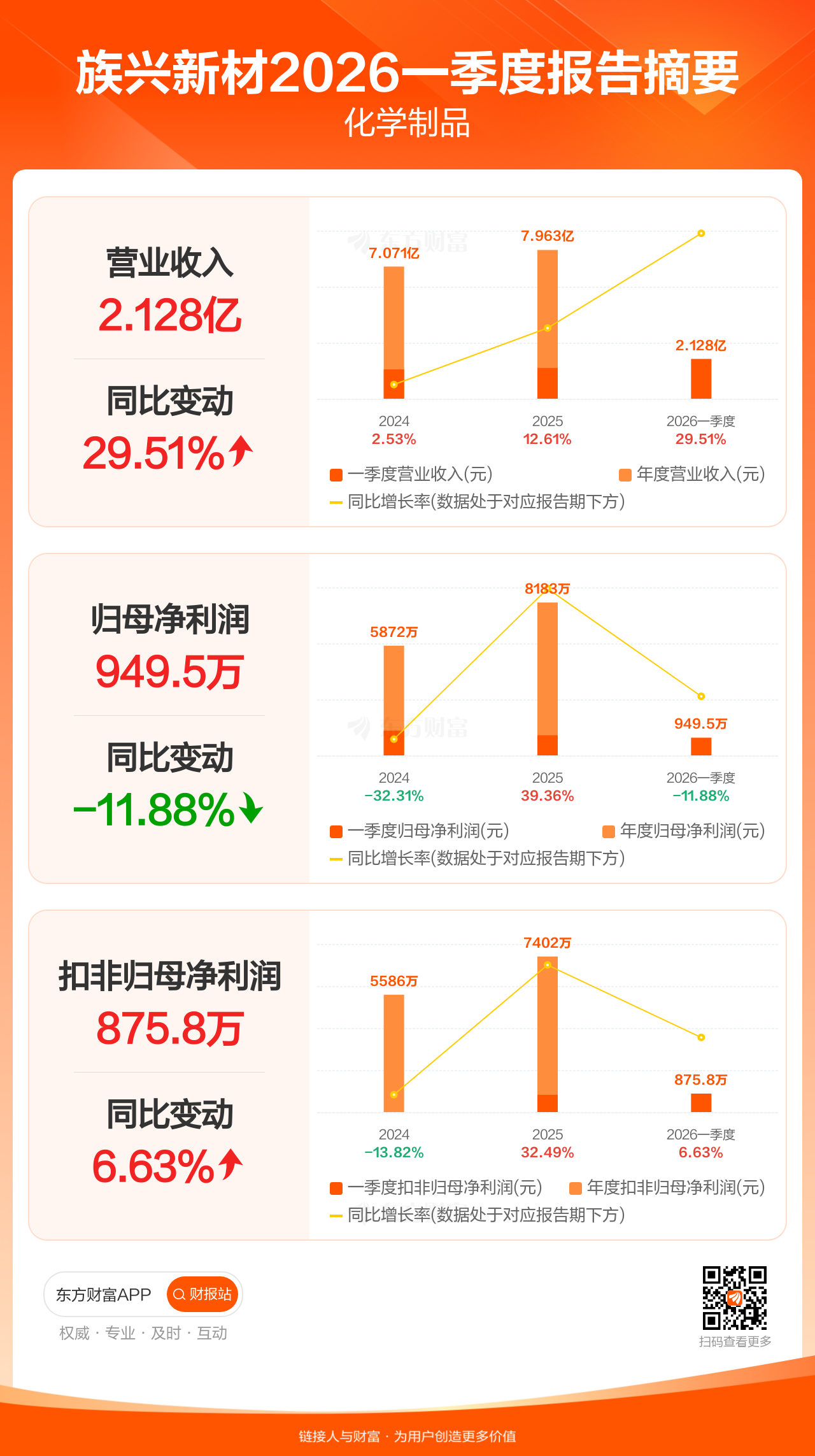族兴新材4月23日发布2026年一季报显示,公司一季度实现营业收入2.13亿元,同比增长29.51%;归母净利润949.55万元,同比下滑11.88%;扣非归母净利润875.84万元,同比增长6.63%。