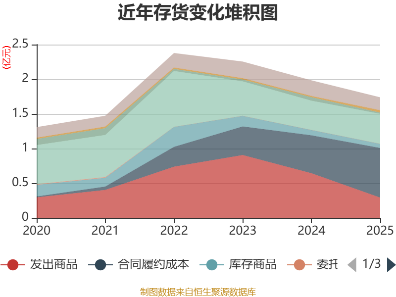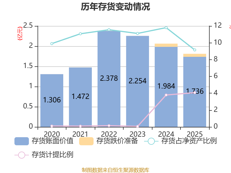 从存货变动来看,截至2025年末,公司存货账面价值为1.74亿元,占净资产的9.15%,较上年末减少2474.79万元。其中,存货跌价准备为735.74万元,计提比例为4.07%。