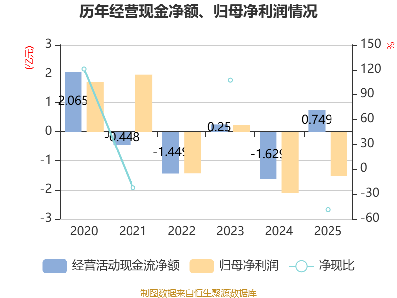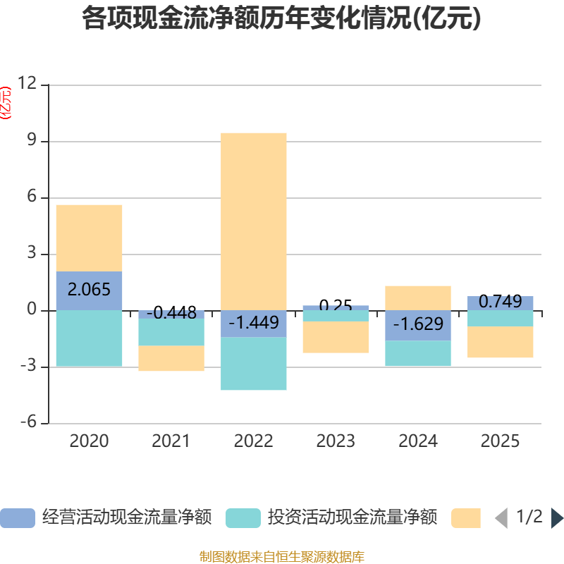 截至2025年,公司经营活动现金流净额为7492.12万元,同比增加2.38亿元;筹资活动现金流净额-1.65亿元,同比减少2.94亿元;投资活动现金流净额-8669.72万元,上年同期为-1.34亿元。