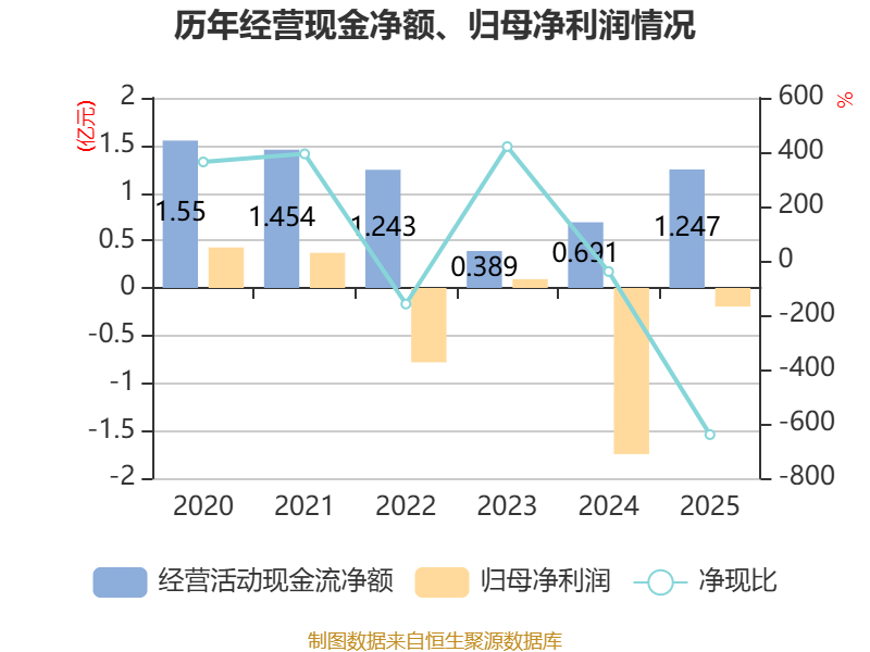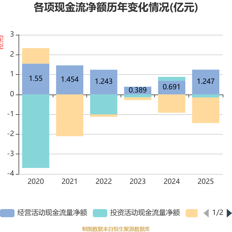 截至2025年,公司经营活动现金流净额为1.25亿元,同比增长80.57%;筹资活动现金流净额-1.29亿元,同比减少3694.89万元;投资活动现金流净额-1499.89万元,上年同期为1925.46万元。