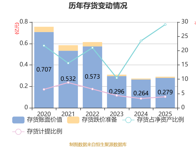 从存货变动来看,截至2025年末,公司存货账面价值为2789.91万元,占净资产的29.13%,较上年末增加152.21万元。其中,存货跌价准备为112.21万元,计提比例为3.87%。