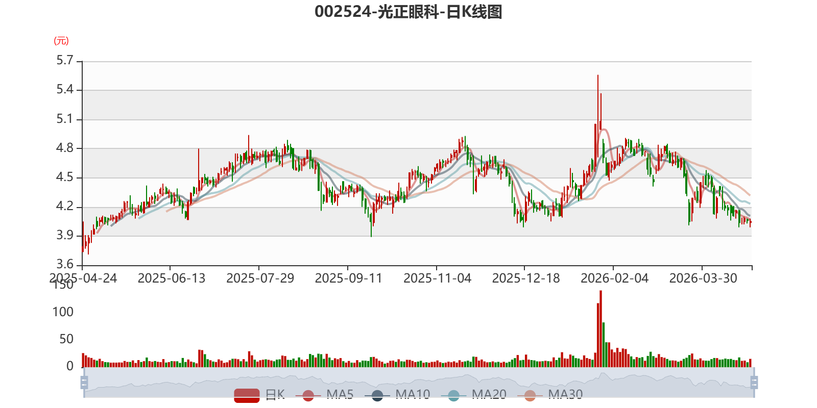 值得注意的是,中登公司数据显示,截至2026年4月17日,光正眼科12.54%股份处于质押状态。年报显示,第一大股东光正投资有限公司质押6460万股公司股份,占其全部持股的50.01%。