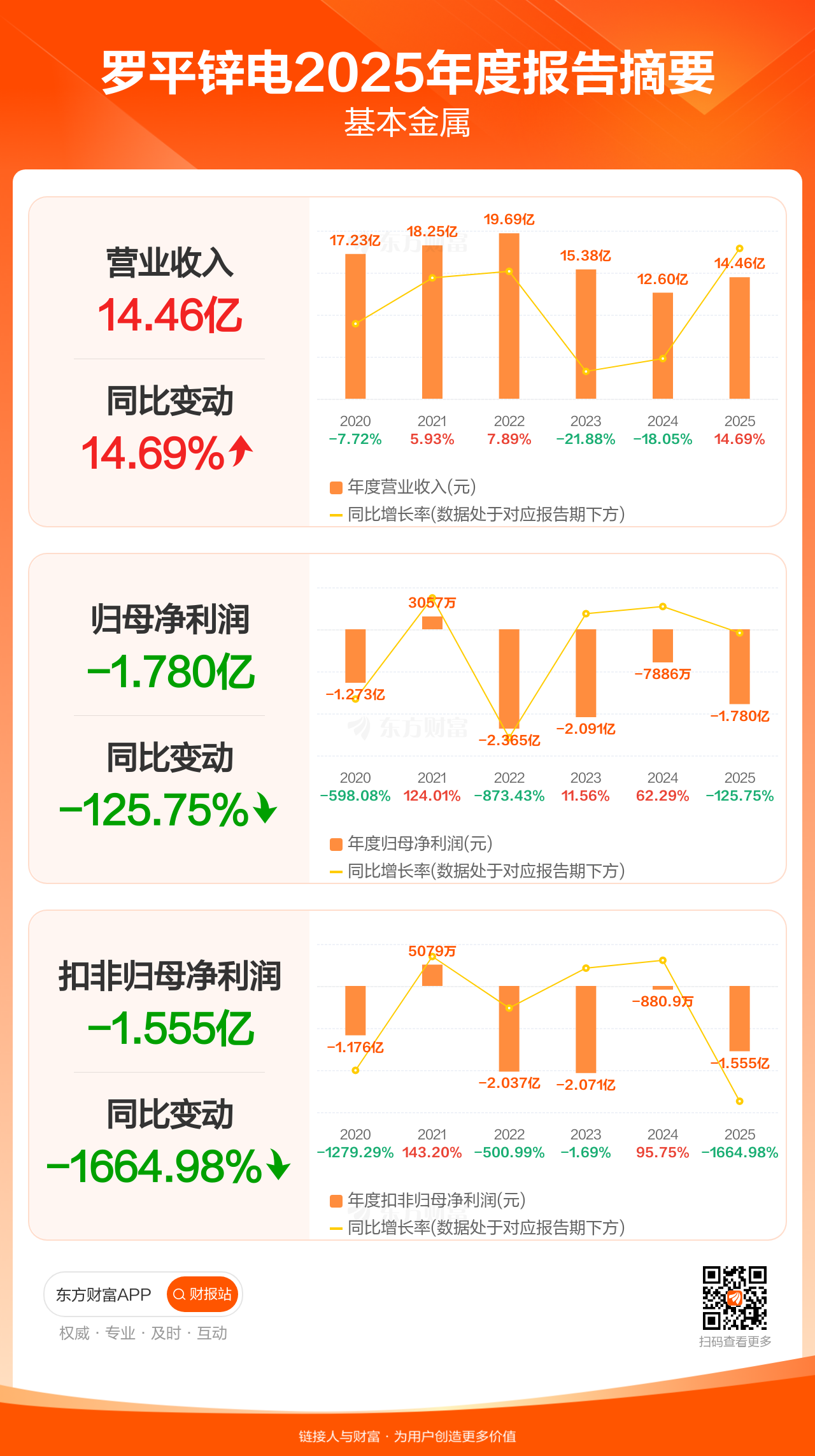罗平锌电4月24日发布2025年年报显示,公司全年实现营业收入14.46亿元,同比增长14.69%;归母净利润-1.78亿元;扣非归母净利润-1.55亿元。