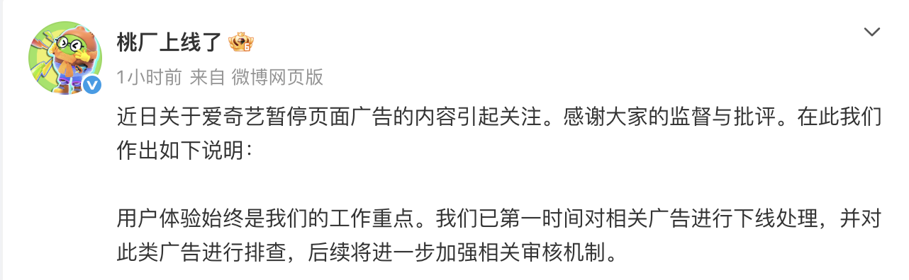 4月23日晚,爱奇艺公司官方发言人账号@桃厂上线了发文称,已第一时间对相关广告进行下线处理,并对此类广告进行排查,后续将进一步加强相关审核机制。