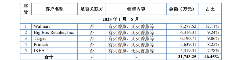 数据显示,2025年1月-8月,美通香薰对前五名客户的销售金额共计3.17亿元,占公司总营收的比例约46.45%。2023年至2024年,这一占比分别为48.26%和43.78%。这种与大客户的绑定,往往是一把“双刃剑”,在获得稳定订单的同时,一旦核心客户调整策略,美通香薰的业绩将面临直接冲击。