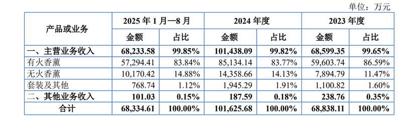 2025年1月-8月,有火香薰实现营收约5.73亿元,占美通香薰总营收的83.84%;无火香薰营收为1.02亿元,营收占比约14.88%;套装及其他产品营收为768.74万元,营收占比为1.12%。此外,美通香薰还开展其他业务,但营收体量相对较小,2025年1月-8月营收占比仅0.15%。