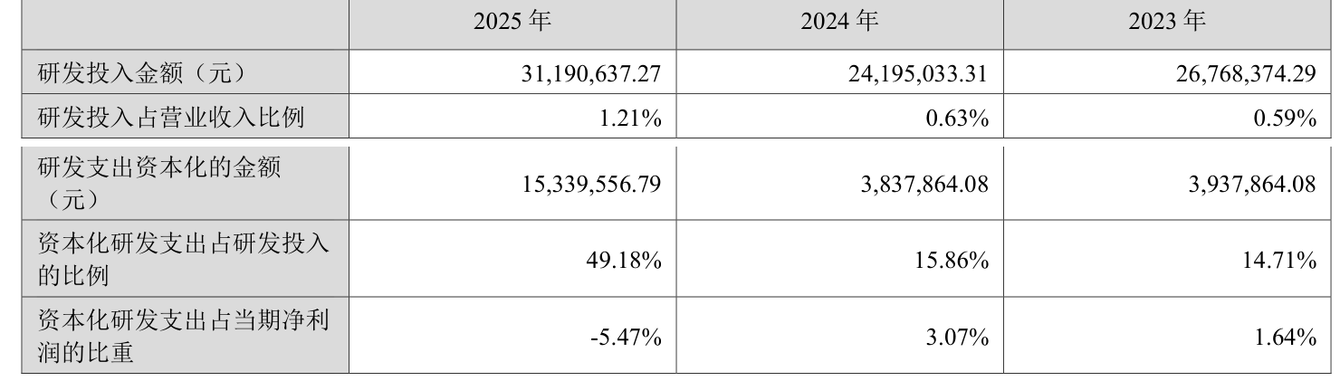 2025年全年,公司研发投入金额为3119.06万元,同比增长28.91%;研发投入占营业收入比例为1.21%,相比上年同期上升0.58个百分点。此外,公司全年研发投入资本化率为49.18%。