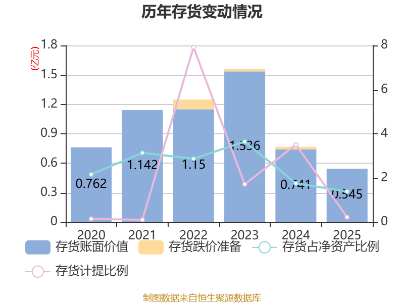 从存货变动来看,截至2025年末,公司存货账面价值为5451.08万元,占净资产的1.39%,较上年末减少1954.46万元。其中,存货跌价准备为12.68万元,计提比例为0.23%。