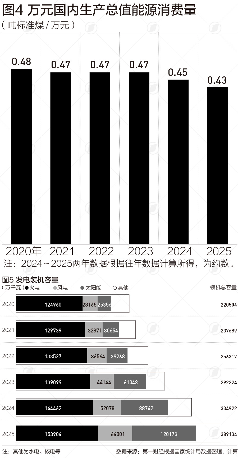 从发电装机容量看,“十四五”时期,非化石能源发电装机容量超过化石能源。第一财经根据国家统计局数据整理、计算发现,从2020年到2025年,火电装机容量从12.5亿千瓦增长到15.4亿千瓦;太阳能发电装机容量从2.5亿千瓦增长到12亿千瓦,增幅达380%。火电装机容量占比从56.7%下降到39.6%;太阳能发电装机容量占比从11.5%增长到30.9%。