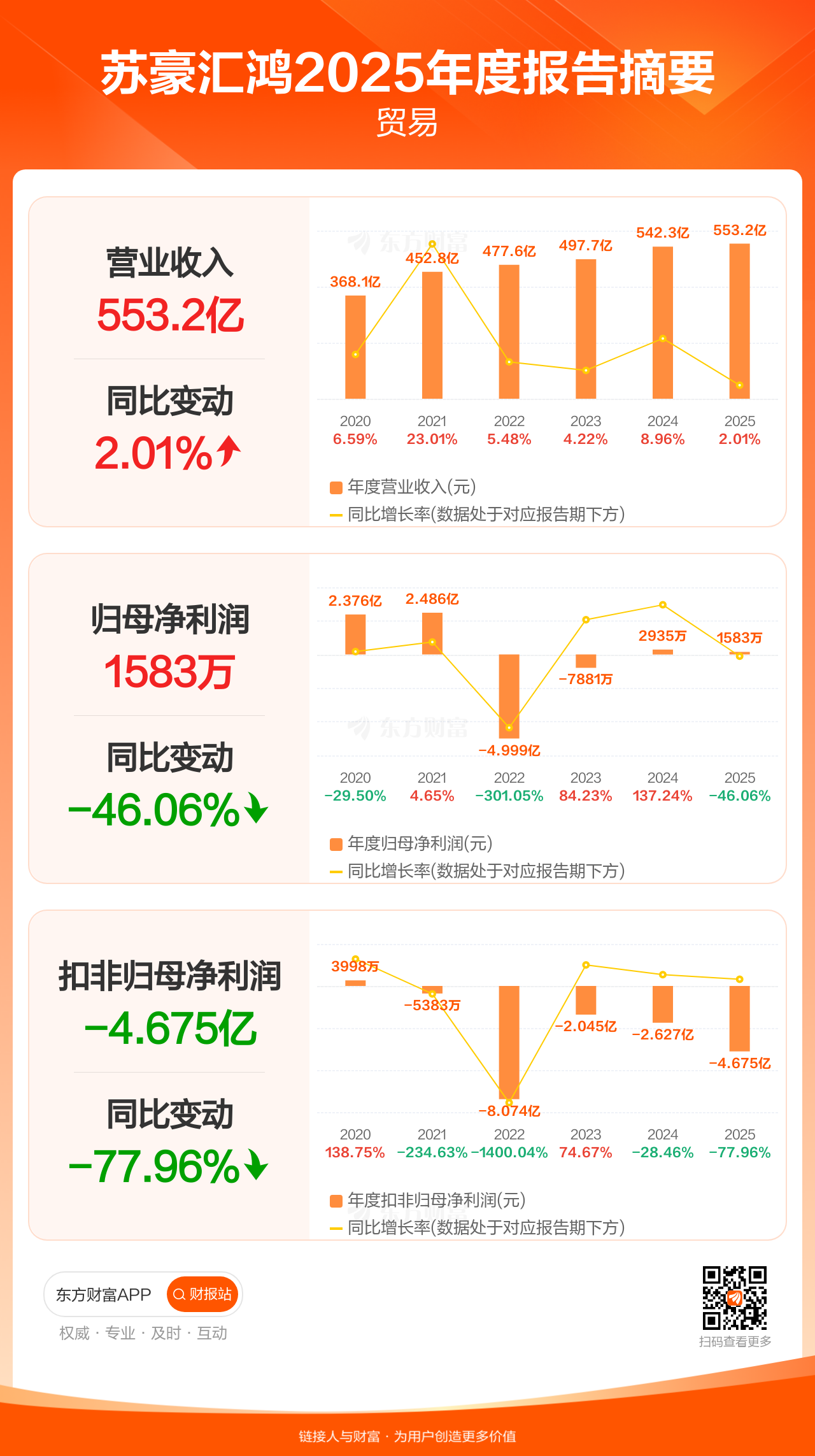 苏豪汇鸿4月24日发布2025年年报显示,公司全年实现营业收入553.23亿元,同比增长2.01%;归母净利润1583.16万元,同比下滑46.06%;扣非归母净利润-4.67亿元。