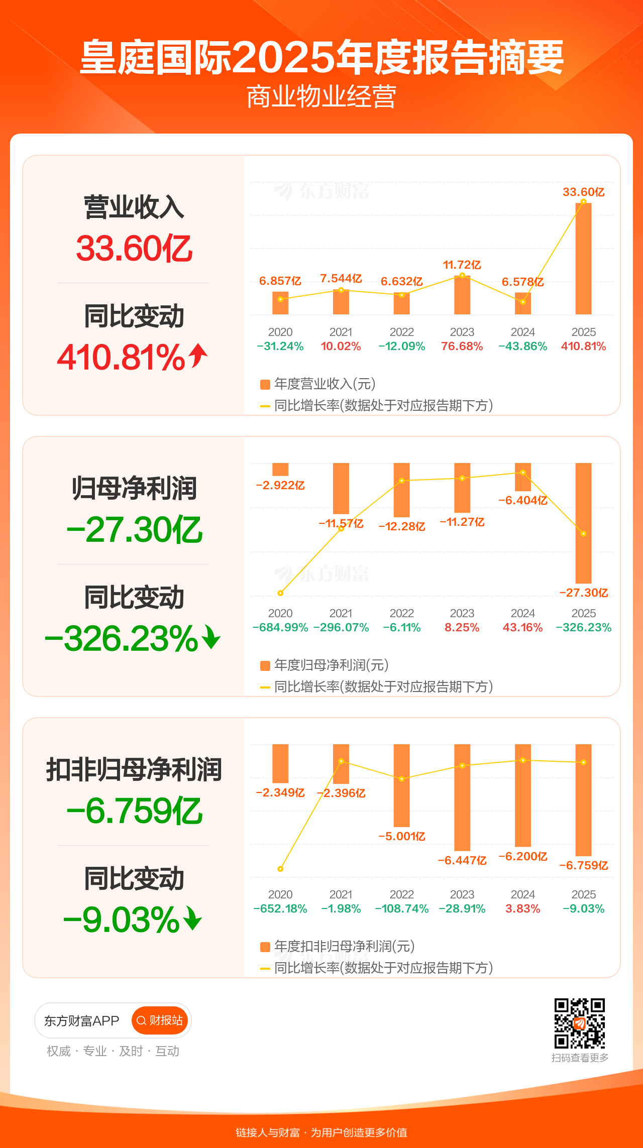皇庭国际4月24日发布2025年年报显示,公司全年实现营业收入33.60亿元,同比增长410.81%;归母净利润-27.30亿元;扣非归母净利润-6.76亿元。