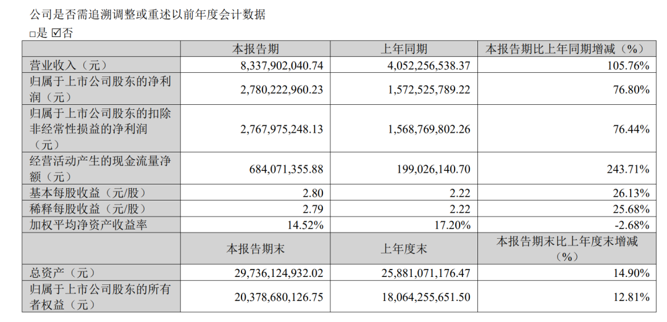 4月23日晚间,大牛股新易盛发布一季度财报。数据显示,第一季度营业收入为83.38亿元,同比增长105.76%;归母净利润为27.80亿元,同比增长76.80%,环比下降13%。