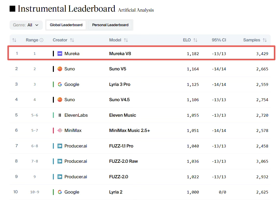 Mureka V8在Artificial Analysis Instrumental(乐器)中的排名表现