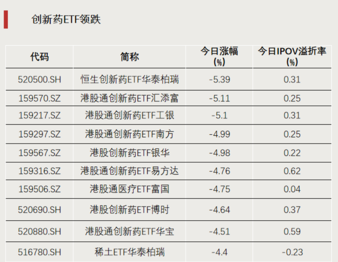 4月23日,创新药赛道表现低迷,多只相关ETF跌幅居前。跌幅前十的ETF产品中,有9只与港股通创新药或港股创新药主题相关。其中,恒生创新药ETF华泰柏瑞跌5.39%,跌幅居首。
