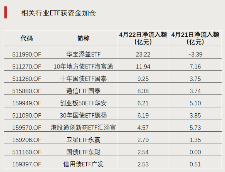 4月22日,通信ETF国泰、创业板50ETF华安、卫星ETF永赢等科技成长方向产品获资金加仓。