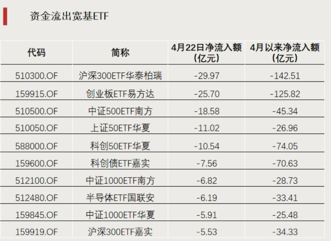 4月22日,宽基ETF继续呈现资金流出状态。沪深300ETF华泰柏瑞净流出29.97亿元居首,创业板、中证500等多只宽基ETF均出现不同程度资金撤离。截至4月22日,沪深300ETF华泰柏瑞、创业板ETF易方达4月以来净流出额均超百亿元。