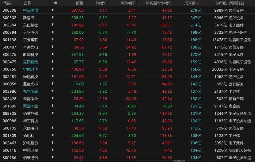 个股方面,4078只个股收跌,跌停股30只;1330只个股收涨,涨停股58只。24只个股日成交额超过100亿元,中际旭创收涨1.17%报897元/股,新易盛收跌2.32%报608.28元/股,天孚通信收跌6.74%报350.09元/股。亨通光电收涨5.69%,光迅科技涨逾6%。