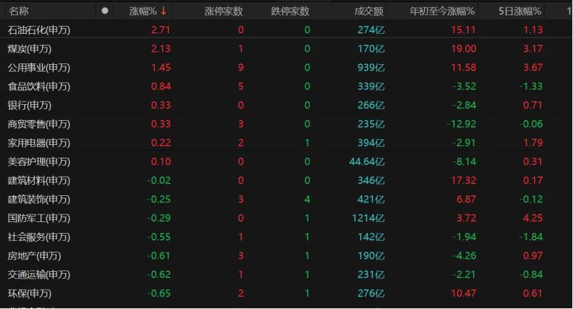 石油石化、煤炭板块领涨,公用事业、食品饮料、银行、商贸零售、家用电器、美容护理等板块收红。