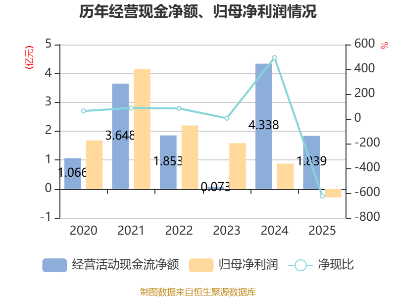 截至2025年,公司经营活动现金流净额为1.84亿元,同比下降57.62%;筹资活动现金流净额1804.89万元,同比增加1307.8万元;投资活动现金流净额-1.67亿元,上年同期为-5.19亿元。