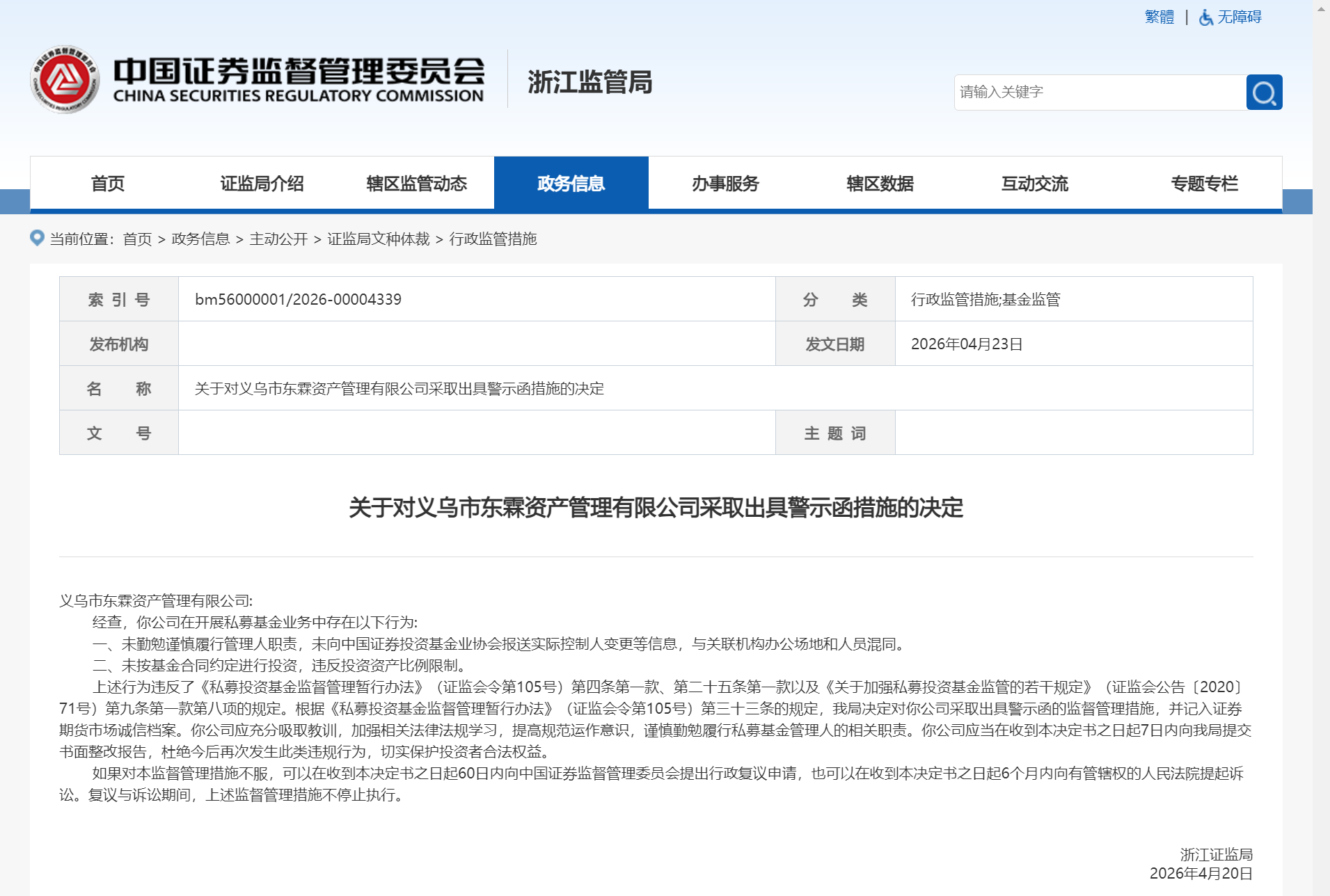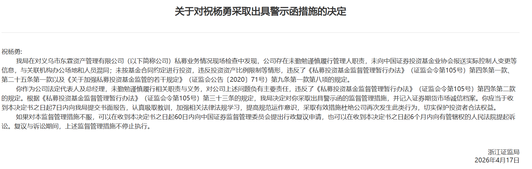 4月23日,浙江证监局发布关于对义乌市东霖资产管理有限公司(以下简称义乌东霖资管)及其两相关责任人华更利、祝杨勇采取出具警示函措施的决定。