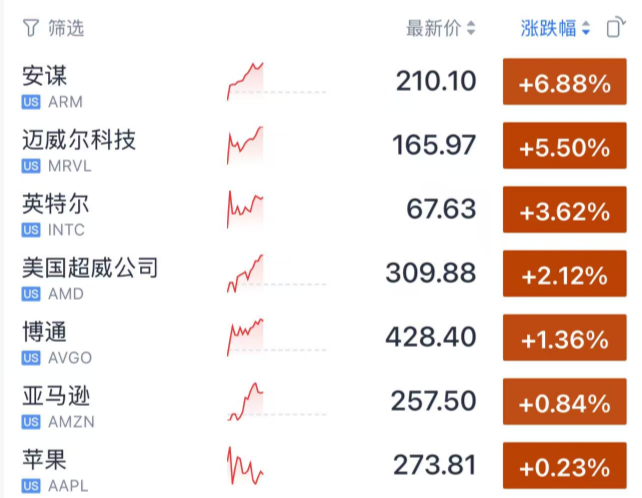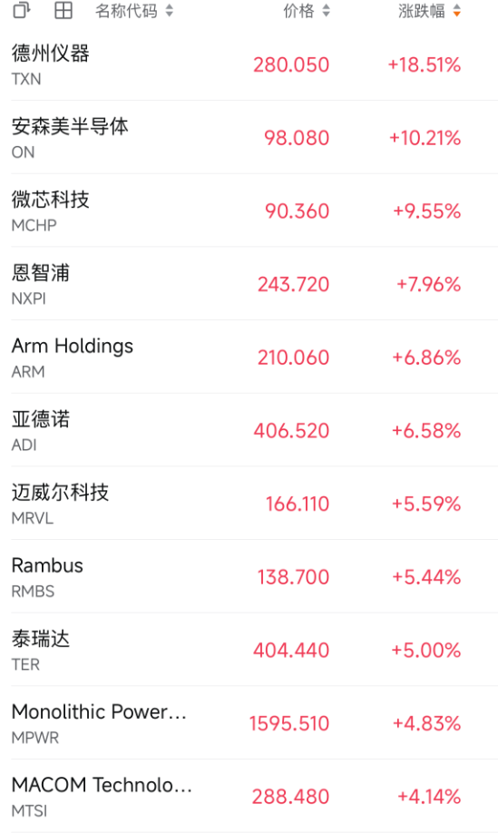此外,费城半导体指数现涨约3%,突破一万点整数关,实现创纪录的17连涨。成份股中,除了德州仪器,安森美半导体涨超10%,亚德诺、恩智浦涨超6%,迈威尔科技涨超5%。