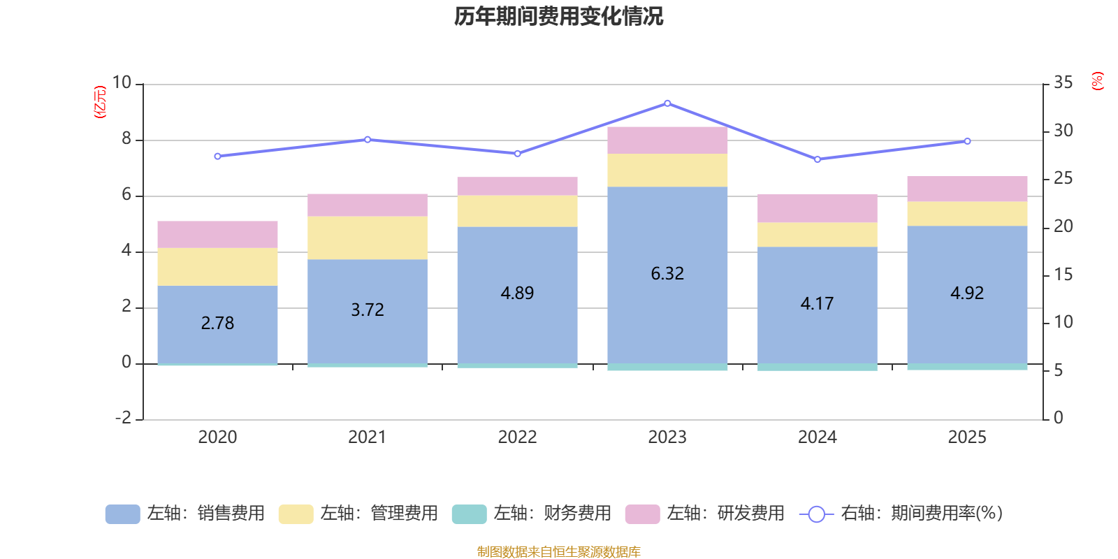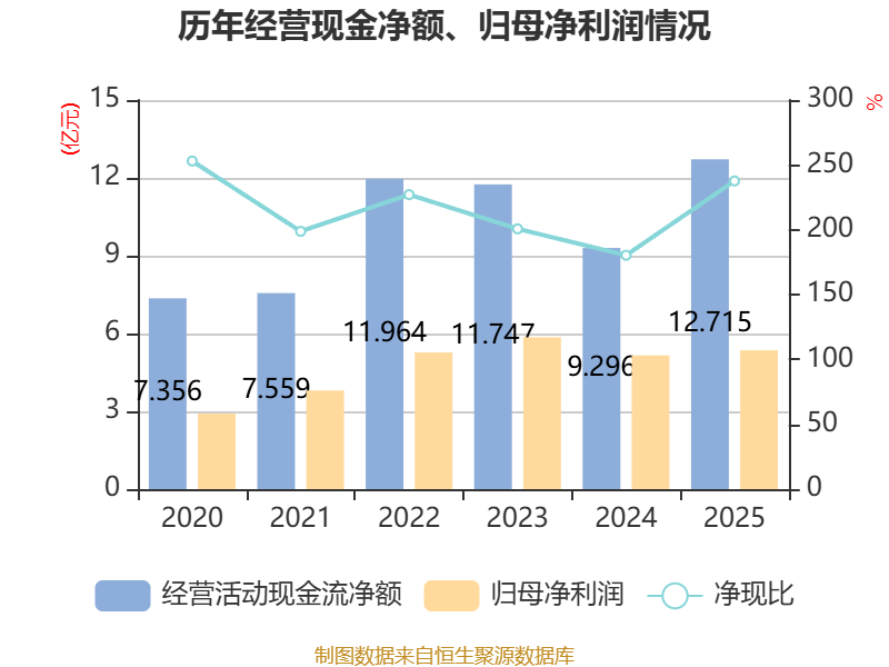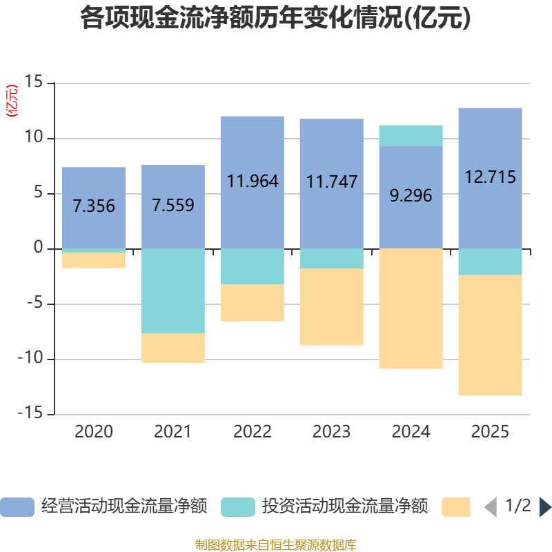 截至2025年,公司经营活动现金流净额为12.72亿元,同比增长36.78%;筹资活动现金流净额-10.9亿元,与同期相比基本不变;投资活动现金流净额-2.42亿元,上年同期为1.86亿元。