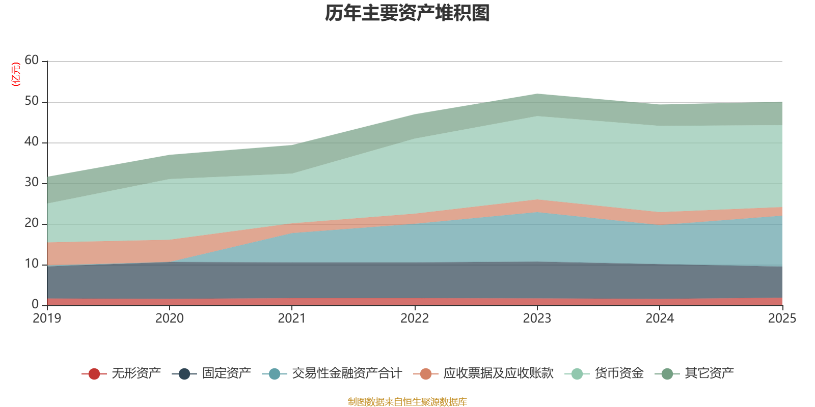 资产重大变化方面,截至2025年末,公司交易性金融资产合计较上年末增加30.13%,占公司总资产比重上升5.53个百分点;货币资金较上年末减少4.92%,占公司总资产比重下降2.66个百分点;应收票据及应收账款较上年末减少33.72%,占公司总资产比重下降2.23个百分点;固定资产较上年末减少10.12%,占公司总资产比重下降1.96个百分点。