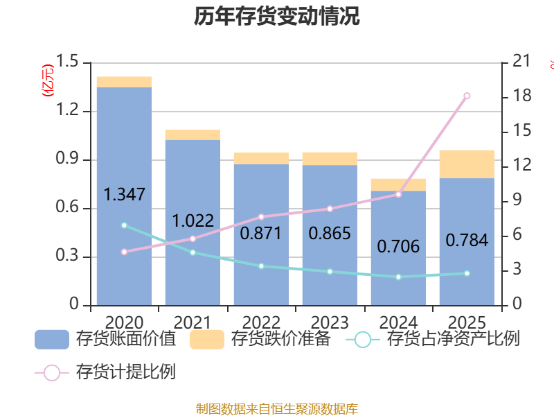 从存货变动来看,截至2025年末,公司存货账面价值为7841万元,占净资产的2.74%,较上年末增加779.08万元。其中,存货跌价准备为1734.2万元,计提比例为18.11%。