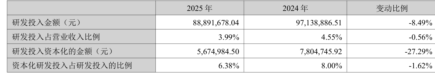 2025年全年,公司研发投入金额为8889.17万元,同比下降8.49%;研发投入占营业收入比例为3.99%,相比上年同期下降0.56个百分点。此外,公司全年研发投入资本化率为6.38%。
