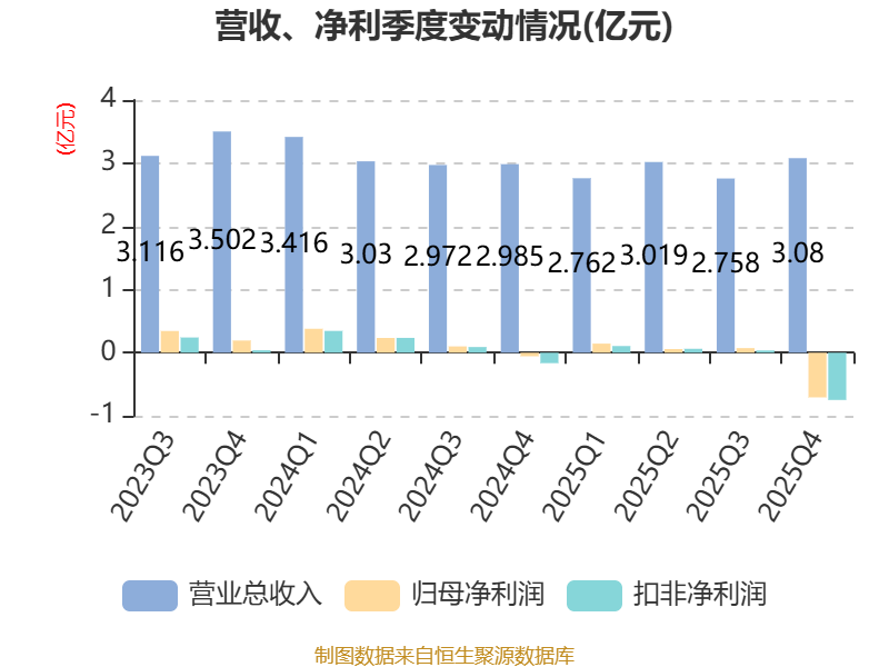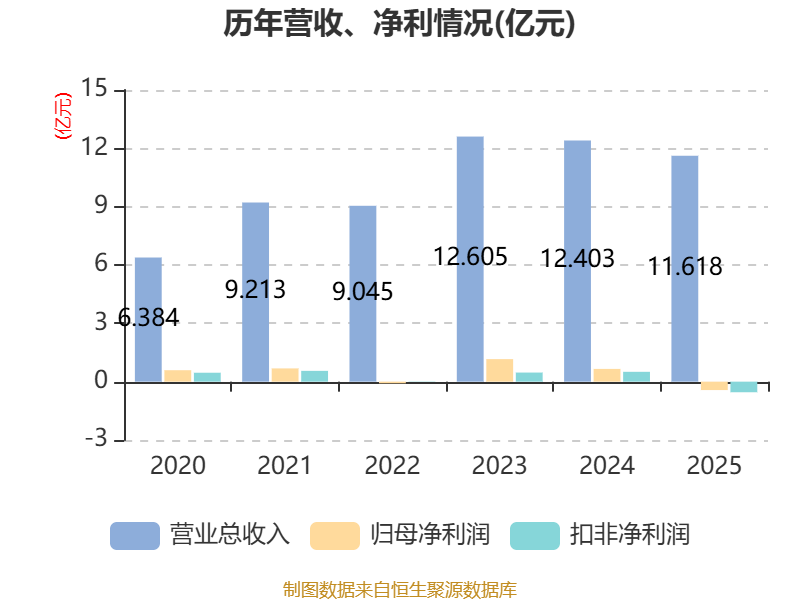 中证智能财讯华培动力(603121)4月24日披露2025年年度报告。2025年,公司实现营业总收入11.62亿元,同比下降6.33%;归母净利润亏损4317.97万元,上年同期盈利6561.4万元;扣非净利润亏损5437.38万元,上年同期盈利5055.83万元;经营活动产生的现金流量净额为8644.89万元,同比下降66.41%;报告期内,华培动力基本每股收益为-0.13元,加权平均净资产收益率为-3.70%。