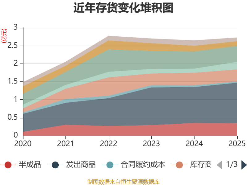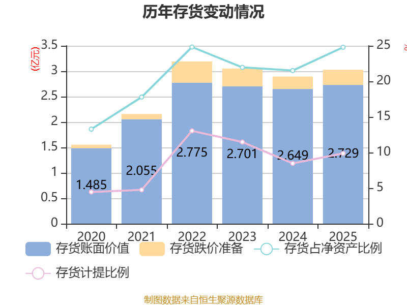 从存货变动来看,截至2025年末,公司存货账面价值为2.73亿元,占净资产的24.79%,较上年末增加794.24万元。其中,存货跌价准备为2988.46万元,计提比例为9.87%。