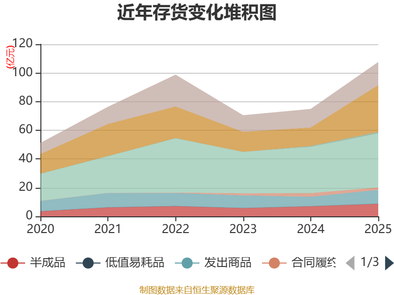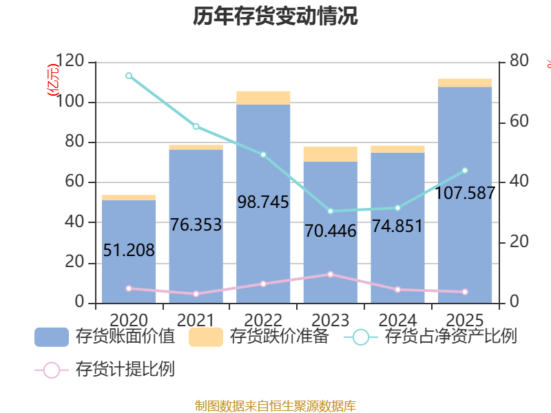 从存货变动来看,截至2025年末,公司存货账面价值为107.59亿元,占净资产的43.97%,较上年末增加32.74亿元。其中,存货跌价准备为4.07亿元,计提比例为3.65%。