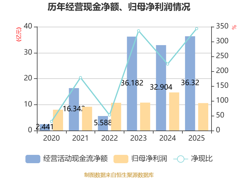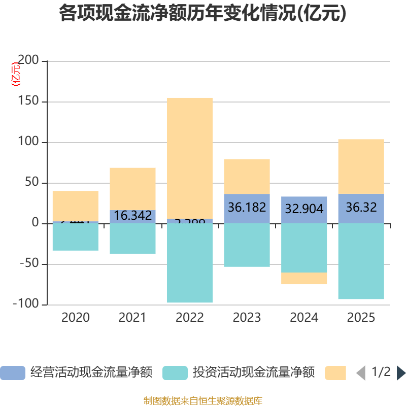 截至2025年,公司经营活动现金流净额为36.32亿元,同比增长10.38%;筹资活动现金流净额67.22亿元,同比增加81.61亿元;投资活动现金流净额-93.28亿元,上年同期为-60.62亿元。