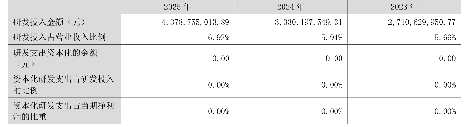 2025年全年,公司研发投入金额为43.79亿元,同比增长31.49%;研发投入占营业收入比例为6.92%,相比上年同期上升0.98个百分点。此外,公司全年研发投入资本化率为0%。