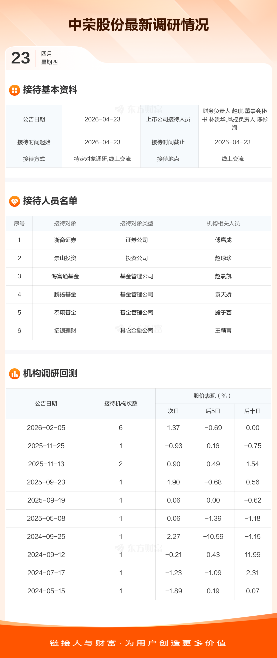 中荣股份4月23日公告称,4月23日接待浙商证券等6家机构调研。接待人员包括财务负责人 赵琪,董事会秘书 林贵华,风控负责人 陈彬海。