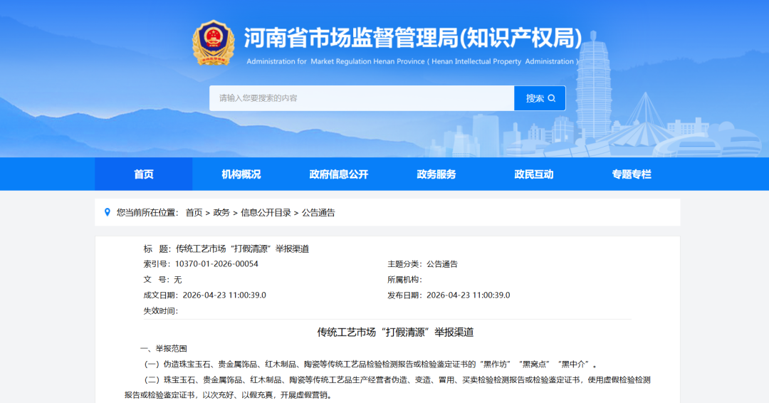 【大河财立方消息】4月23日,河南省市场监督管理局发布消息,开通“打假清源”举报渠道,严厉打击传统工艺市场中的虚假行为。