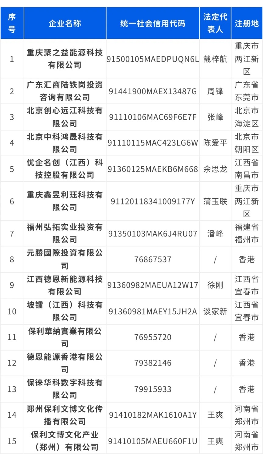 此外,保利集团称,重庆聚之益能源科技有限公司、广东汇商陆铁岗投资咨询有限公司、北京创心远江科技有限公司等公司系通过伪造印章、注册材料,将企业注册为保利集团下属公司的假冒国企,实际与保利集团及所属公司无任何隶属与股权关系,也不存在任何投资、合作、业务等关系。(完)