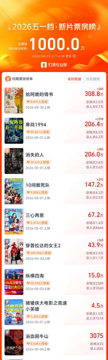 据灯塔专业版,截至4月23日,2026年五一档新片点映及预售总票房突破1000万,《给阿嬷的情书》《寒战1994》《消失的人》《10间敢死队》《三心两意》暂列前五名。