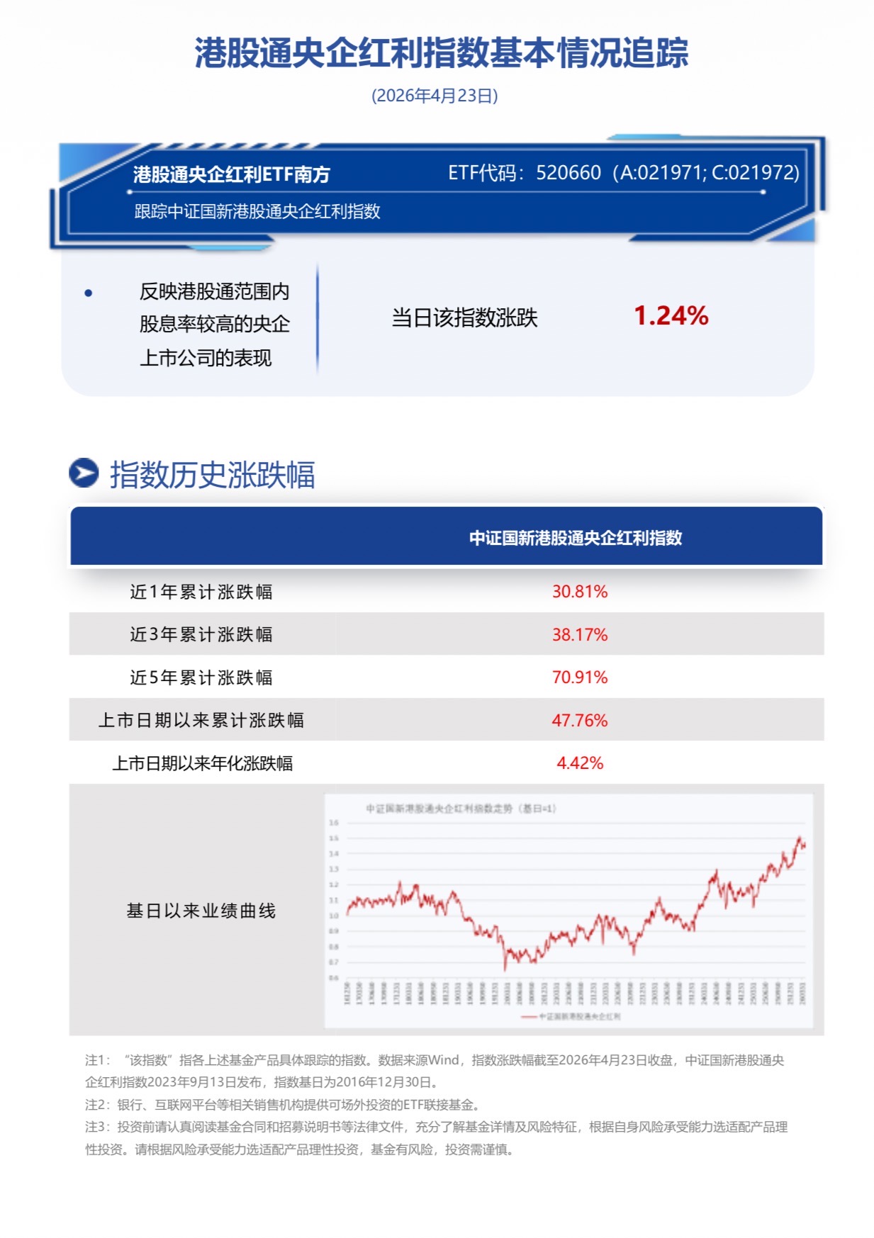 截至2026年4月23日收盘,港股通央企红利ETF南方(520660)换手3.61%,成交0.96亿元,跟踪标的指数中证国新港股通央企红利指数(931722.CSI) 涨1.24%。