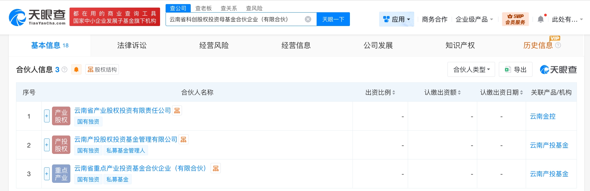 天眼查App显示,近日,云南省科创股权投资母基金合伙企业(有限合伙)成立,执行事务合伙人为云南产投股权投资基金管理有限公司,出资额约50亿元人民币,经营范围为以私募基金从事股权投资、投资管理、资产管理等活动。合伙人信息显示,该基金由云南省产业股权投资有限责任公司、云南产投股权投资基金管理有限公司、云南省重点产业投资基金合伙企业(有限合伙)共同出资。