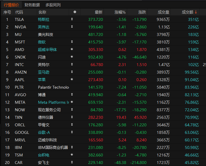 第14名德州仪器收高19.43%,成交70.99亿美元。德州仪器2026年第一季度营收、利润及二季度指引均超出市场预期,AI相关业务增长强劲,传统业务复苏支撑股价走高。
